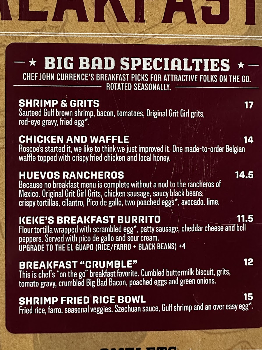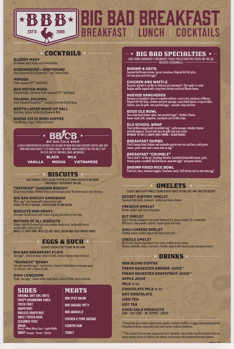 This is chef's "On the go" breakfast favorite. Crumbled buttermilk biscuit, grits, tomato gravy, crumbled big bad bacon, poached eggs and green onions. Consuming raw or undercooked meats, poultry, seafood, shellfish, or eggs may increase your risk of food-borne illness, especially if you have certain medical conditions.